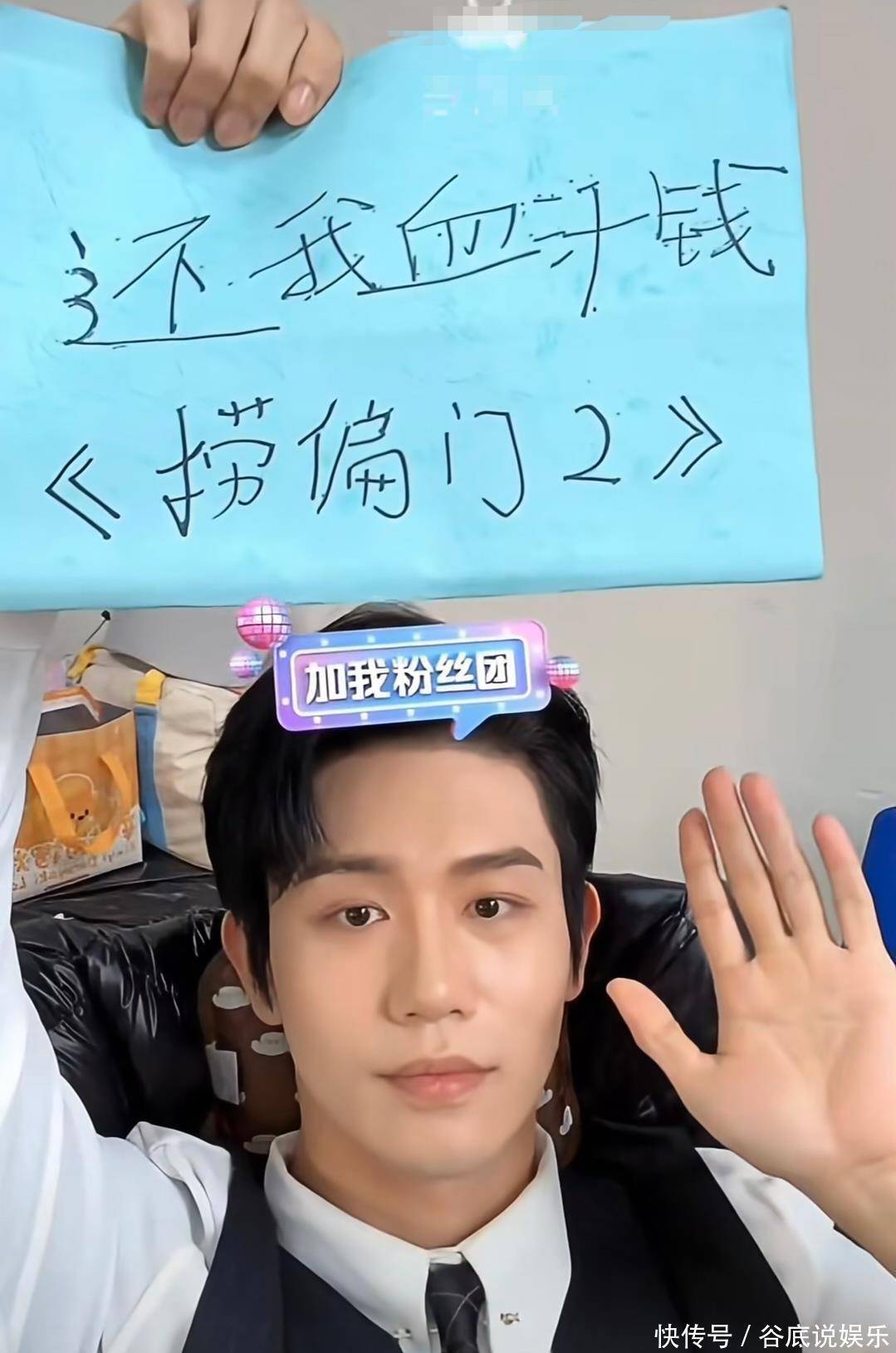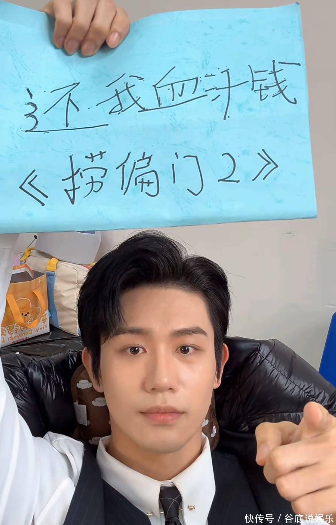 由于实在是太生气了,他找来了笔和纸,并说“抵制行业乱象,从我做起。”值得注意的是,他用手举起的纸上写了剧组的名字以及诉求,再配合他的表情和动作,给人感觉他是真的没辙了。